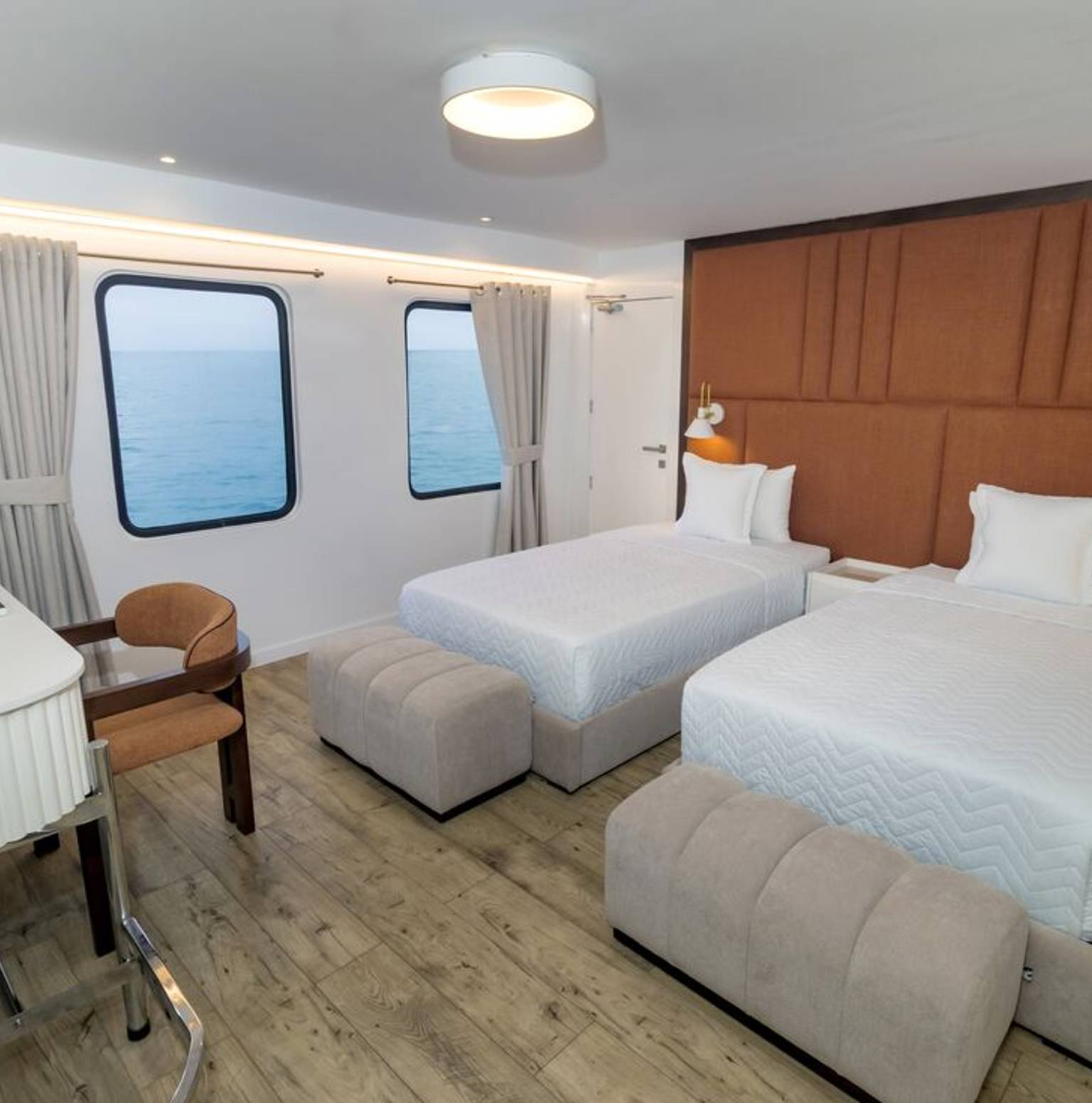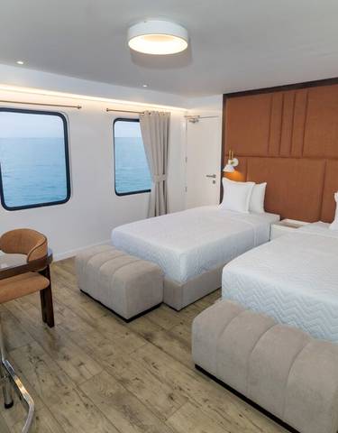 Las embarcaciones de crucero de Galápagos ofrecen alojamientos que van desde cabinas estándar hasta suites exclusivas. El catamarán M/C Anahi proporciona seis cabinas dobles (14 m²) en la cubierta principal y dos cabinas suite (25 m²) en la cubierta superior con comodidades modernas. El Isabela II presenta camarotes con vista al océano mientras que el Grand Queen Beatriz ofrece cabinas con balcón. Como comentó un viajero de TourRadar: "Nuestra cabina en el Archipel I fue sorprendentemente espaciosa con ventanas grandes y comodidades modernas - mucho más cómoda de lo esperado."
