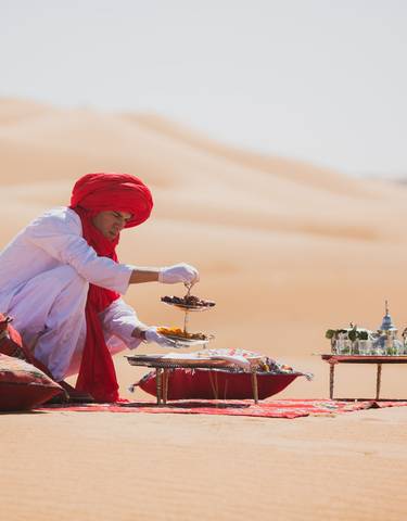 Estas experiencias exclusivas del desierto se distinguen por momentos cuidadosamente seleccionados y acceso especial. Los paseos privados en camello al atardecer te llevan por las dunas ondulantes del Erg Chebbi, seguidos de comidas preparadas por chefs personales bajo cielos despejados del desierto. Tendrás entrada privada a lugares importantes como la Kasbah Ameridhl en el Oasis de Skoura y ceremonias privadas del té con familias bereberes en el Valle del Dades. La experiencia se extiende a clases prácticas de cocina en los jardines de Tahanaout y visitas guiadas privadas a sitios de la UNESCO como Ait Benhaddou. Como compartió un viajero de TourRadar: "Tuvimos una de las experiencias más hermosas de nuestras vidas con cada detalle perfectamente seleccionado, desde el campamento privado del desierto hasta los encuentros locales auténticos."