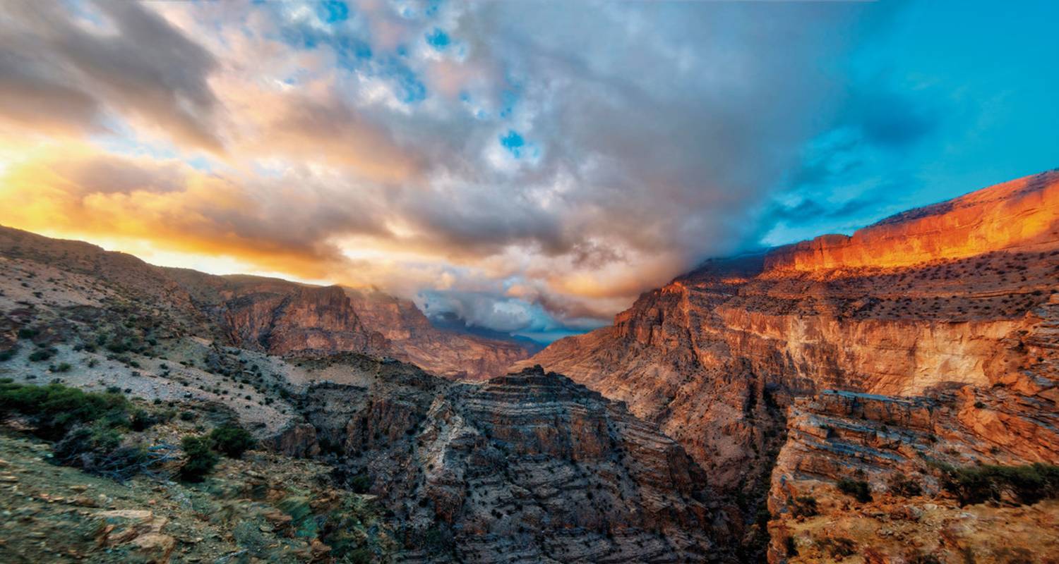 Espectacular circuito de tres días que recorre 5 destinos principales: la histórica fortaleza de Nizwa, el pico Jebel Shams (3.010 m), el cañón de Wadi Nakhr, las piscinas de Wadi Bani Khaled y las dunas de Wahiba Sands. Incluye desayuno diario y transporte en 4x4.