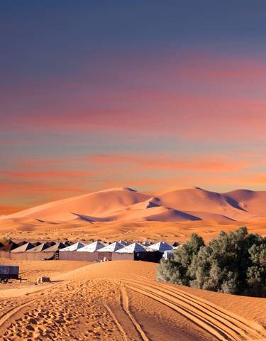 Las estrellas del Sáhara brillan durante la acampada en Merzouga, mientras la música tradicional envuelve Khamlia. Explora la medina de Marrakech, el Palacio Bahía, las Gargantas del Dadés y saborea pescado fresco en el puerto de Esauira.