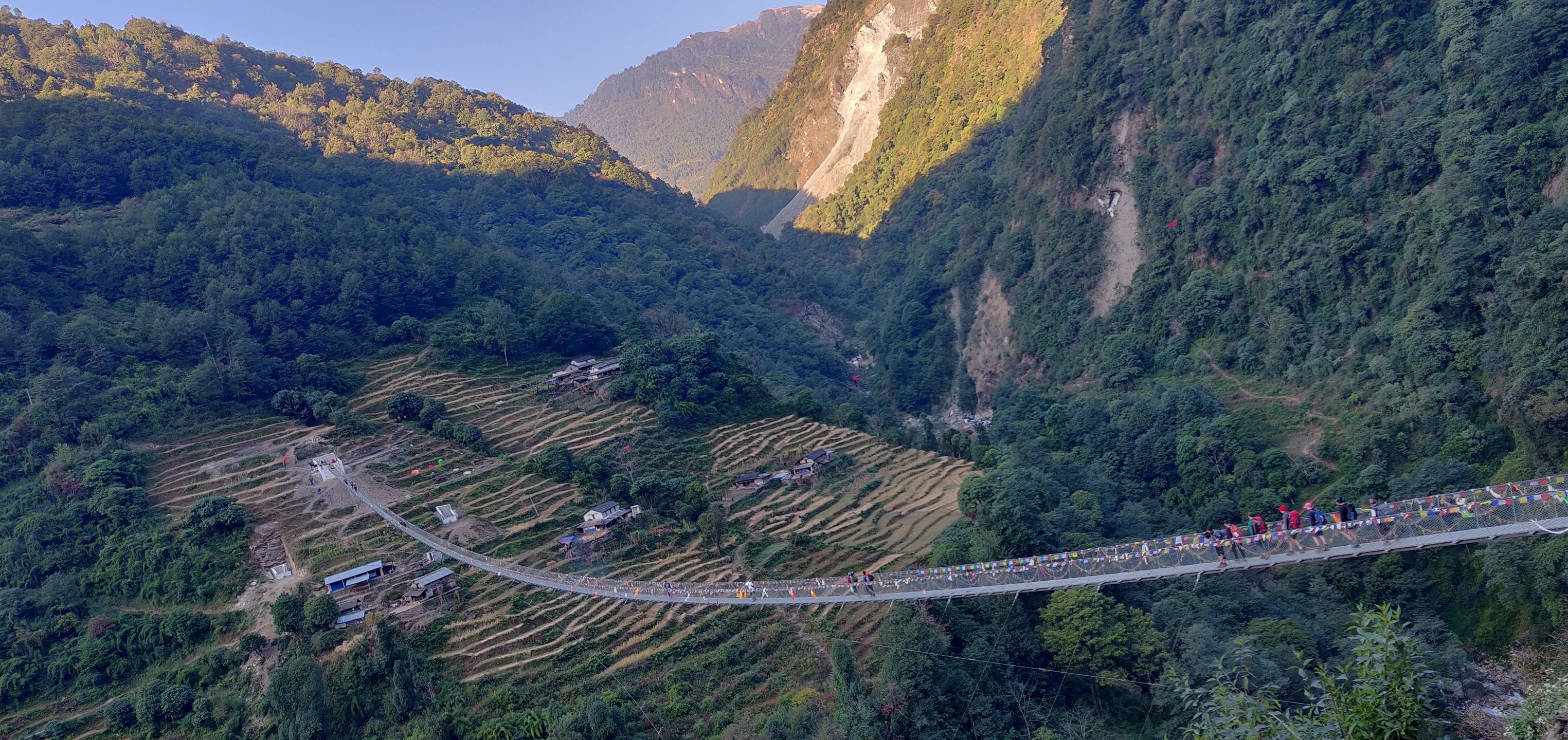 - Día 2 Vuela de Katmandú a Pokhara (914 m), conduce a Nayapul, y haz el trekking a Chhomrong (2170 m) - 6-7 Horas. (D/A/C)