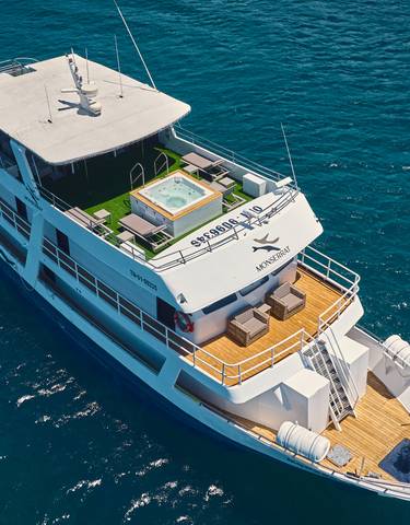La aventura de cuatro noches del M/Y Seaman abarca cuatro islas únicas. Destacan el snorkel en la Corona del Diablo, la visita a Bahía Post Office en Floreana, la vista del respiradero dramático de Española y la navegación por Caleta Tortuga Negra en panga.