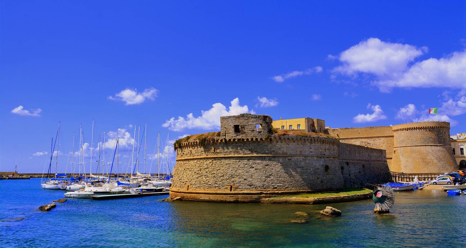 Duración 8 días Destinos Bari, Castel del Monte, Parque Nacional de Alta Murgia, Alberobello, Porto Cesareo, Gallipoli, Lecce, Otranto, Brindisi Franja de edad Edades 18+ Idioma Solo: Alemán Valoración física Fácil Distancia 561 mi Operador Terranova Touristik Desde